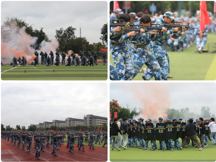 会上,军事训练成果展示环节精彩纷呈。包括“匕首操”、“刺杀操”、“擒敌拳”、“军体拳”、“反恐维稳”、“警棍盾牌”等不同演练类型的方阵展示,各个方阵的出色表现,展现了新生们经过军事训练后焕然一新的精神风貌。