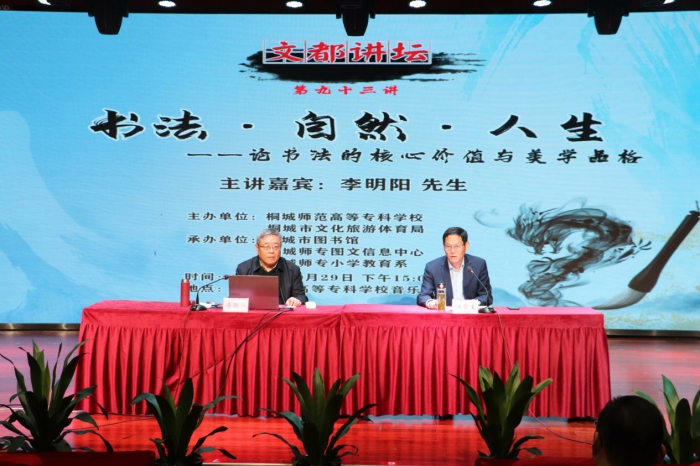 金秋桐城,墨香满园。10月29日,桐城师范高等专科学校与桐城市文旅体局联合举办的“文都讲坛”第93讲在我校音乐厅隆重举行。本次讲坛特邀李明阳作题为《书法·自然·人生——论书法的核心价值与美学品格》的专题报告。讲坛由校党委副书记、校长江贵生主持。校党委副书记张敏丽,党委委员、宣传部长、办公室主任伍建强,党委委员、小学教育系党总支书记陈涛,桐城市宣传部常务副部长陈炜,桐城市文化旅游体育局党组成员项并玉等出席,校内师生代表200余人共同聆听了这场融通艺术、哲学与生命体验的文化盛宴。说明:IMG_6979