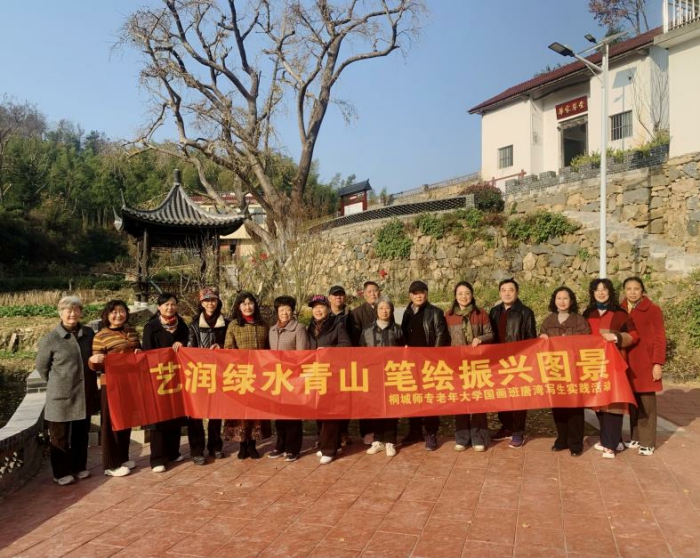 12月1日,桐城师范高等专科学校老年大学绘画班学员在教师严丽莉的带领下,前往唐湾镇蒋潭村,开展户外写生教学活动。学员们以草塘百年古银杏、雾聚茶谷为创作主题,用画笔描绘乡村的自然风貌与人文底蕴,记录村落古朴宁静的生态之美。