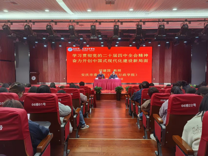 为深入学习贯彻党的二十届四中全会精神,12月2日,学校特邀安庆市委党校(安庆行政学院)胡建国教授来校作专题辅导报告。学校中层干部、学前教育系全体教职工及学生代表参会,学校党委委员、宣传部部长、办公室主任伍建强主持报告会。