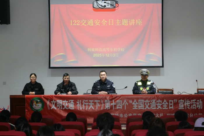 2025年12月2日是第十四个“全国交通安全日”,今年的交通安全日主题是“文明交通礼行天下”。为深入学习贯彻习近平总书记关于安全生产的重要论述精神,切实增强广大师生的交通安全意识和风险防范能力,12月3日上午,学校邀请桐城市经开区派出所、桐城市交警大队来校开展交通安全主题宣传教育活动,积极响应第十四个“全国交通安全日”的号召,学校法治副校长、桐城市经开区派出所副所长肖亮参加了讲座。