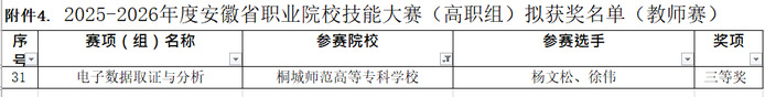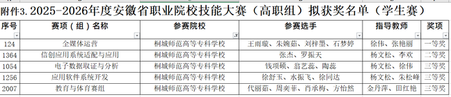 近日,2025-2026年度安徽省职业院校技能大赛(高职组)拟获奖名单公布,桐城师范高等专科学校参赛团队凭借扎实的专业功底与出色的临场表现,斩获一等奖1项、二等奖1项、三等奖4项,再创佳绩!