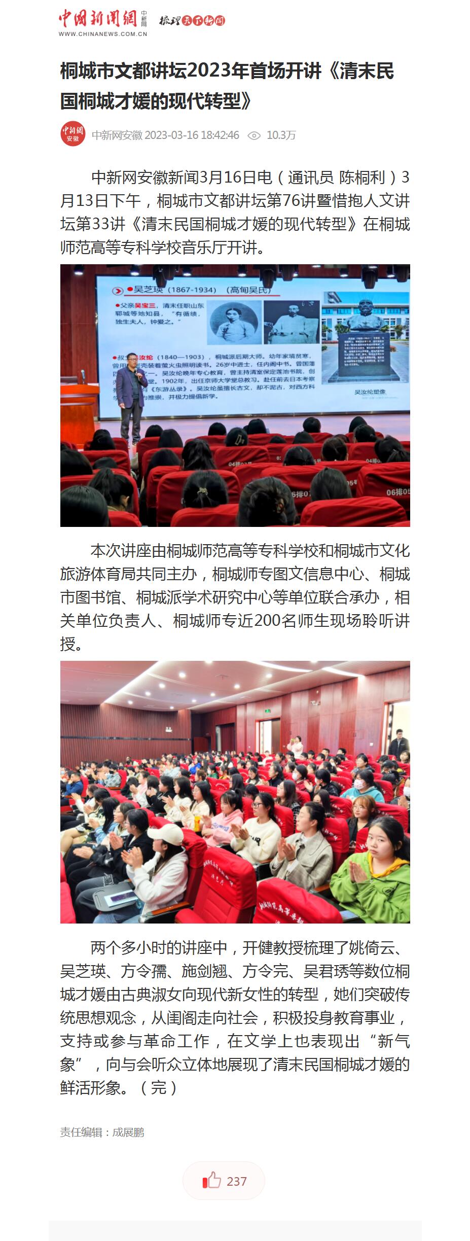 中国新闻网:桐城市文都讲坛2023年首场开讲《清末民国桐城才媛的现代转型》