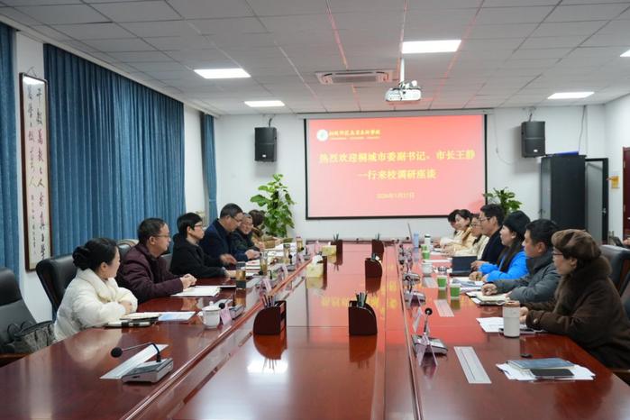 1月27日,桐城市委副书记、市长王静一行来校调研座谈。校长江贵生出席并主持座谈会。桐城市委常委、常务副市长汪杰贤出席会议,桐城市政府办、教育局、人社局、企业服务中心(科创中心)有关负责同志,学校相关职能部门、院系负责同志参加座谈会。