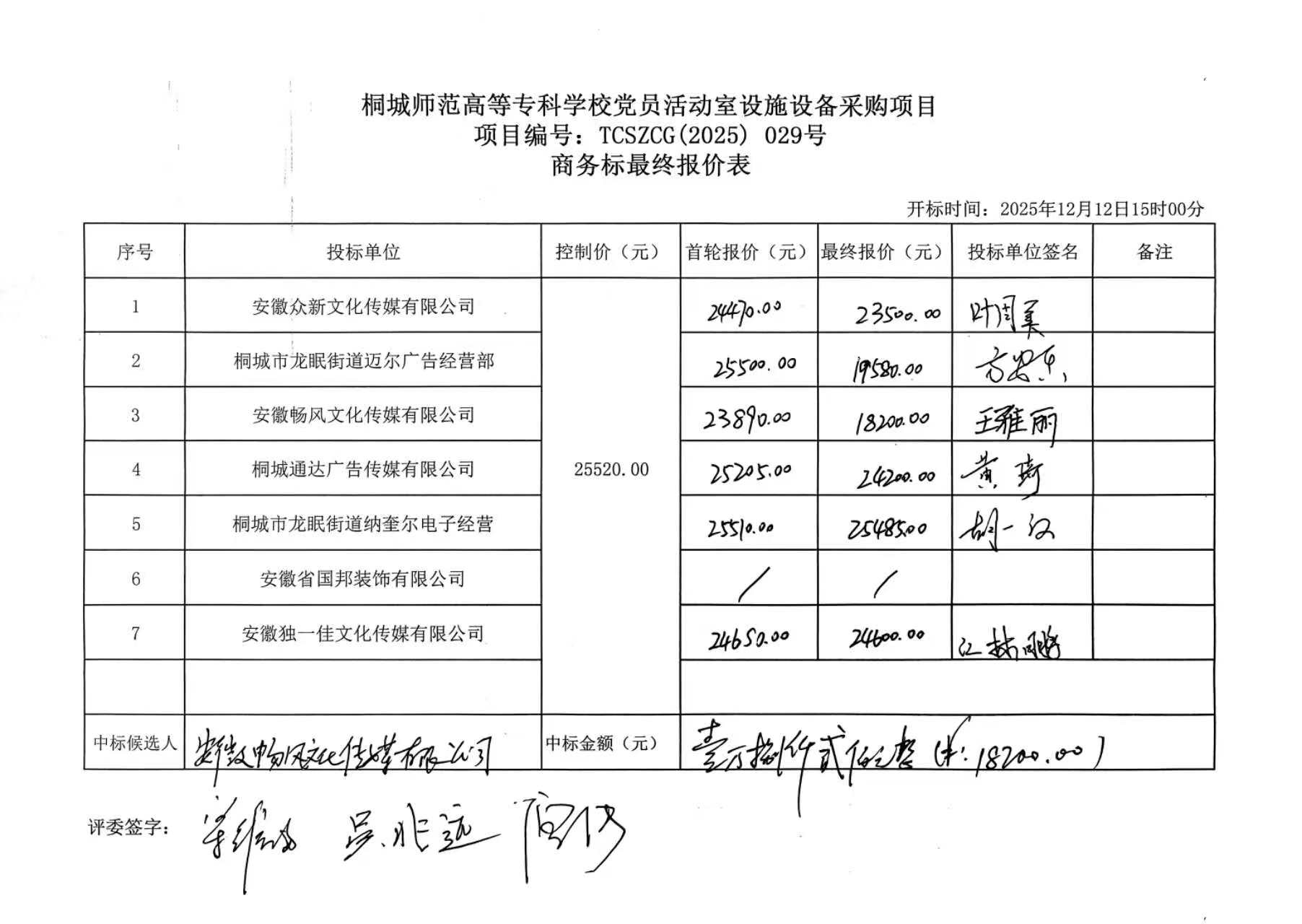 桐城师范高等专科学校党员活动室设施设备采购项目中标结果公示