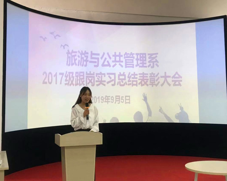 9月5日,旅管系在毓秀楼实训室隆重召开2017级旅游类专业跟岗实习总结表彰大会。2017级旅游类专业全体实习生和指导教师参加了会议。会议由系主任汪庭才老师主持。