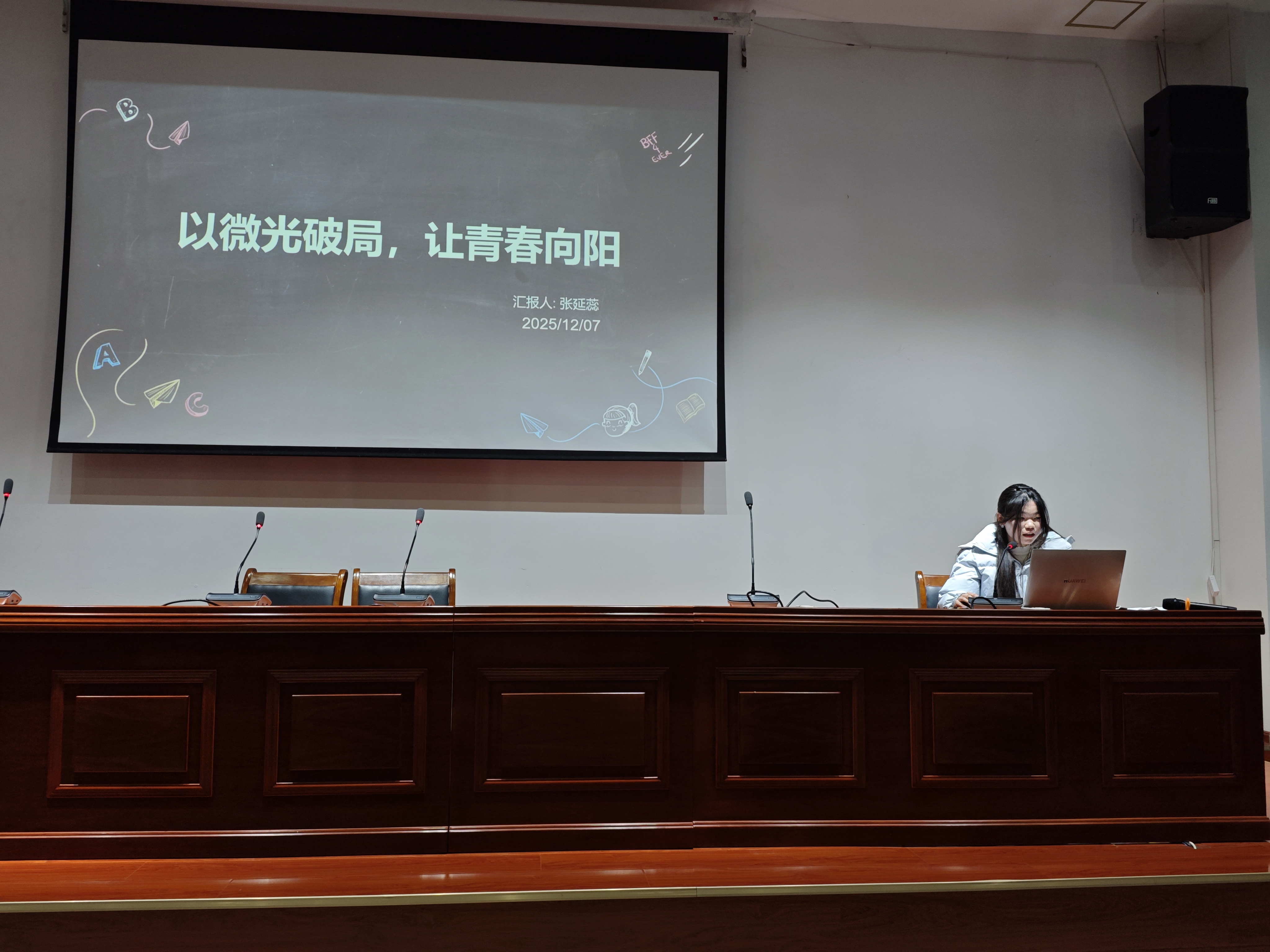张延蕊同学围绕“以微光破局,让青春向阳”展开分享,重点讲述了她在导游服务比赛等赛事中的参与体会。她认为,比奖项更重要的是过程中的锻炼与成长——在比赛中结识同行、提升应变能力、深化专业认知,并最终实现内心的突破与自信的建立。她鼓励大家重视每一次经历的价值,在热爱中全力以赴,在坚持中书写青春。