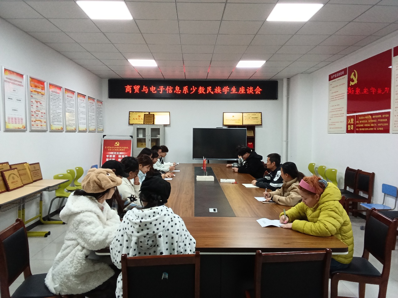 为深入贯彻落实中央民族工作会议精神,扎实推进民族团结进步教育,11月5日,商贸与电子信息系召开少数民族学生座谈会,系党总支副书记殷海红、团总支书记胡艳艳与回族、侗族、布依族、哈尼族等4个民族11余名学生面对面交流。