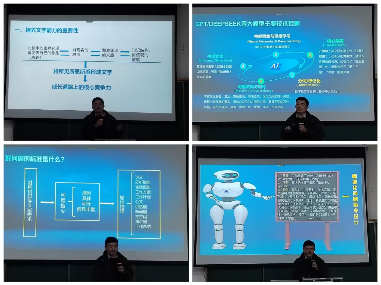 讲座现场互动积极,师生围绕AI在税务分析、公文写作、科研论文等场景中的具体应用展开热烈讨论。在坐学生纷纷表示,此次讲座既有理论高度,又有实践指导意义,为今后在专业学习与工作中融入人工智能工具提供了清晰路径与方法支持。