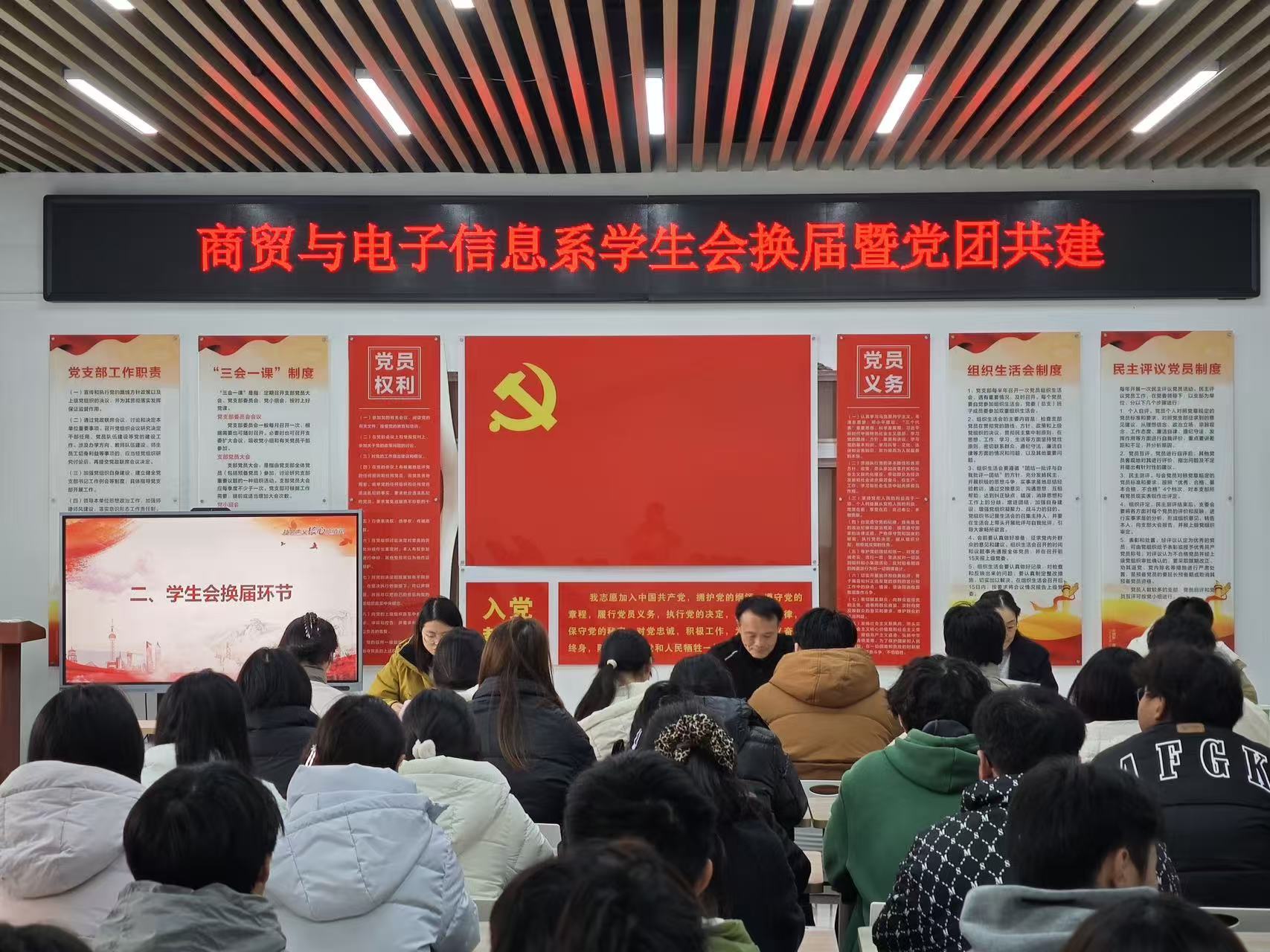 为推进学生会组织建设、促进新老成员融合衔接,2025年12月11日,商贸与电子信息系学生会换届大会暨党团共建活动在5-6号楼一站式社区举行,系党总支书记江向中、主任徐伟、辅导员代表及系学生会全体成员参加了本次活动。