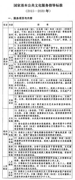(七)建立基本公共文化服务标准体系。以人民群众基本文化需求为导向,围绕看电视、听广播、读书看报、参加公共文化活动等群众基本文化权益,根据国家经济社会发展水平和供给能力,明确国家基本公共文化服务的内容、种类、数量和水平,以及应具备的公共文化服务基本条件和各级政府的保障责任,确立国家基本公共文化服务指导标准,明确政府保障底线,做到保障基本、统一规范。各地要根据国家指导标准,制定与当地经济社会发展水平相适应、具有地域特色的地方实施标准,逐步形成既有基本共性又有特色个性、上下衔接的标准指标体系。标准以县为基本单位推进落实。建立基本公共文化服务标准动态调整机制,根据经济社会的发展变化,适时调整提高具体指标。