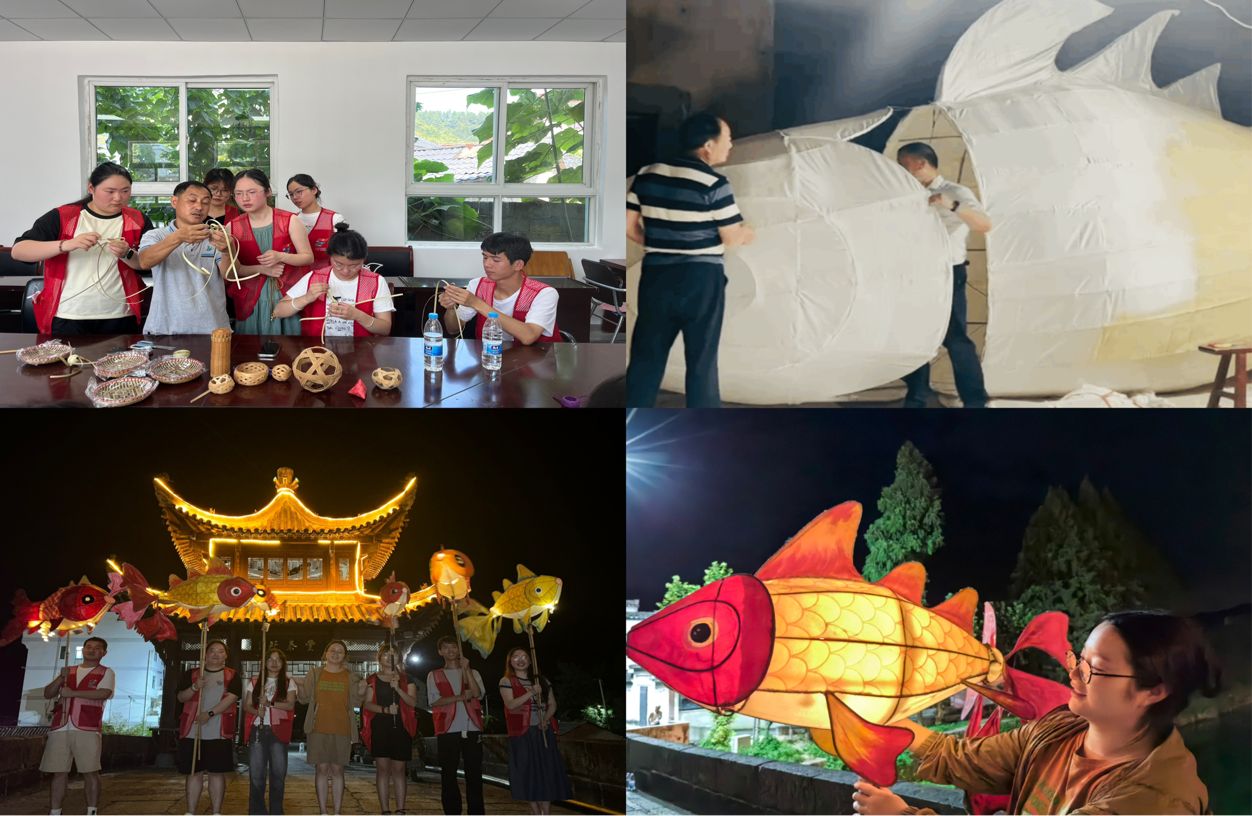 齐聚胡乐圣地,赏悦非遗鱼灯。8月6日,周海平老师带领团队成员了解胡乐“鱼灯”的文化脉络、构成及制作方法,并示范了鱼灯从框架搭建、上浆粘贴等过程需要注意的细节和技巧,成员认真观察学习,利用竹篾、白胶、画布等材料,耐心地编织缠绕鱼灯框架,依次完成扪上画布、脊骨嵌灯、上色绘染等工序,一笔一画地将寓意丰富的构思勾勒在“鱼灯”上,描绘出对美好生活的祝愿。8月7日,为了让团队成员更全面地了解“鱼灯”,当地对接人袁雨晴老师亲自展示了舞蹈动作以及表演方式,并邀请大家参加“鱼灯”夜行活动,团队成员认真学习动作后,手持鱼灯“游”上古街,数盏小鱼灯环绕大鱼灯穿梭于街巷,欢声笑语此起彼伏。