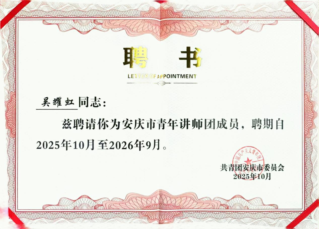 宣讲环节结束后,主办方领导为安庆市青年讲师团成员颁发了聘书。这份聘书不仅是对青年宣讲人过往工作的肯定,更是对大家未来持续开展思想引领、传递青春正能量的期许,进一步激发了青年讲师团成员投身宣讲工作、服务青年成长的责任感与使命感。