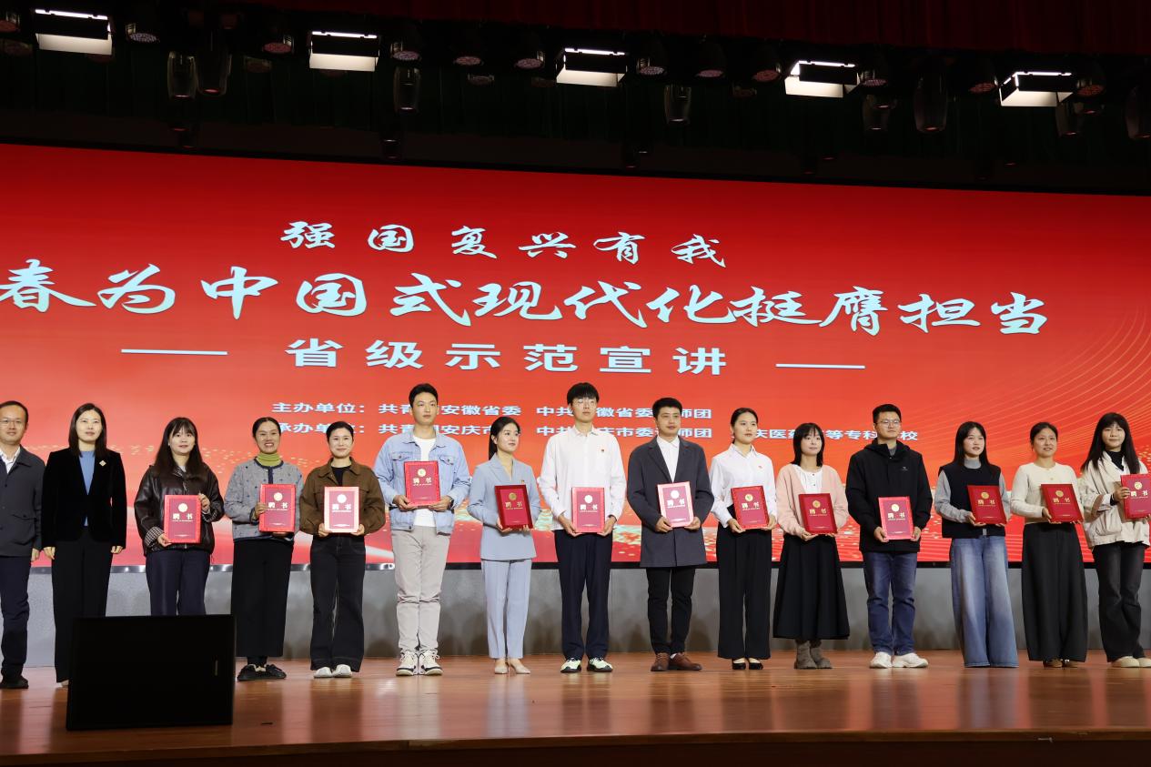 为深入学习贯彻习近平新时代中国特色社会主义思想,激励广大青年在中国式现代化建设中挺膺担当、贡献青春力量,10月27日上午9:00,由团安徽省委、省委讲师团主办,团安庆市委、安庆医药高等专科学校承办的“强国复兴有我,青春为中国式现代化挺膺担当”省级示范宣讲活动,在安庆医药高等专科学校多功能报告厅隆重举行。来自各领域的青年代表齐聚一堂,共话青春使命,我校教师吴耀虹作为安庆市青年讲师团成员,受邀参加活动并作专题宣讲。