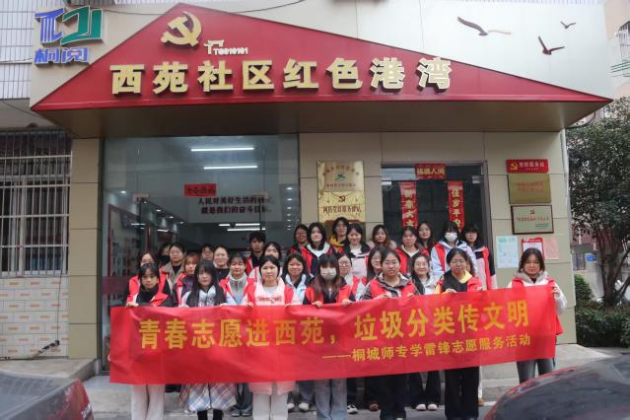 为弘扬雷锋精神,深化志愿服务内涵,普及垃圾分类知识,3月5日学雷锋纪念日当天,我校组织青年志愿者前往桐城市西苑新村红色港湾,开展以“青春志愿进西苑,垃圾分类传文明”为主题的学雷锋志愿服务活动,以实际行动传承雷锋精神,倡导绿色环保生活理念。