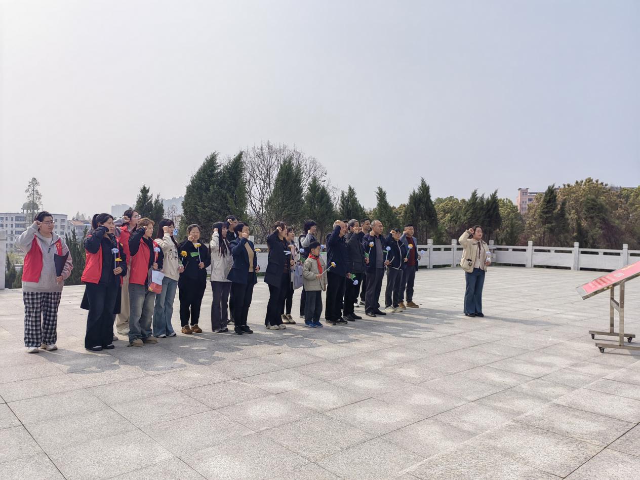 纸花制作完毕,在西苑社区党员同志的带领下,全体学生志愿者前往桐城市烈士陵园,开展英烈祭奠活动,以文明方式寄托对革命先烈的哀思。祭奠现场庄严肃穆,全体人员整齐列队、神情凝重,向革命烈士默哀致敬,深切缅怀英烈们为民族独立、人民解放作出的伟大牺牲。默哀结束后,学生志愿者与社区党员同志一同向烈士塔敬献亲手制作的纸花,鞠躬致意、告慰先烈,用朴素而庄重的方式,表达对革命先烈的无限敬仰与深切缅怀。