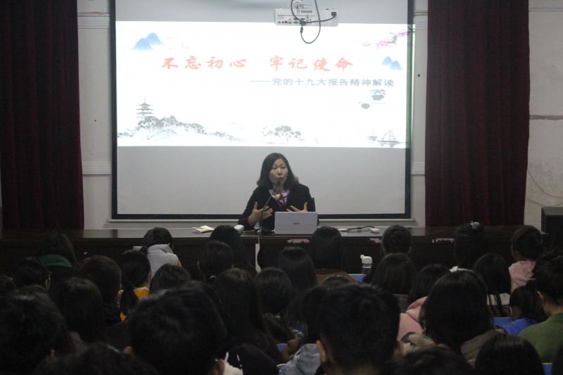 为给全系学生普及十九大和两会相关精神,3月18日晚,小教系分管主任雷小丽在校学生活动中心开展了十九大和两会精神专题报告会。我系全体班干和团干参会。
