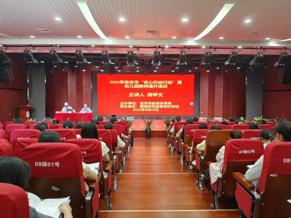 8月20日上午,池州学院学前教育学院谭甲文教授在音乐楼音乐厅为2025年安庆市“安心托幼行动”暨幼儿园教师提升培训班学员做《婴幼儿早期托育教育政策的国际比较与本土启示》的主题讲座。讲座由桐城师范高等专科学校学前教育系主任曹杏田主持。