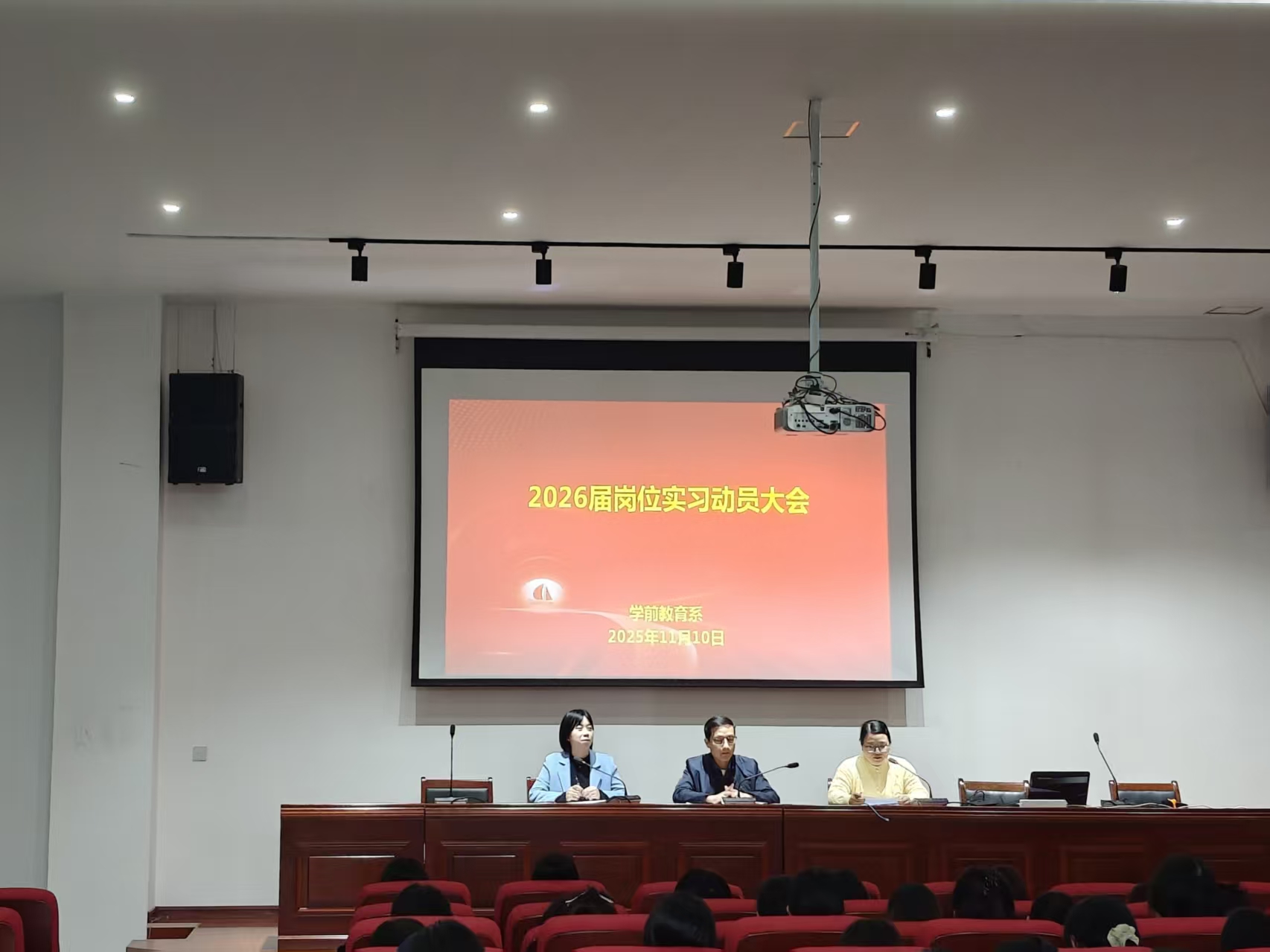 11月10日,学前教育系2026届岗位实习动员会在其昶楼报告厅分两批次举行。学前教育系主任曹杏田、副主任宋晓燕、副书记金丹萍,以及毕业班辅导员、高专23级学前教育专业与早期教育专业全体实习生参加会议。