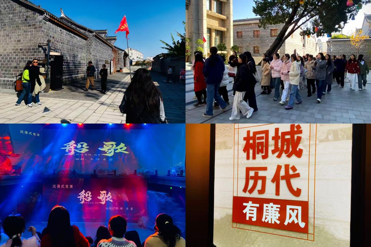 活动伊始,全体党团员集中观看沉浸式红色舞台剧《船歌》。剧中以生动鲜活的情节,诠释了“开天辟地、敢为人先,坚定理想、百折不挠,立党为公、忠诚为民”的红船精神核心要义。随后,同学们前往六尺巷廉洁文化陈列馆开展学习。在讲解员的引导下了解“千里家书只为墙,让他三尺又何妨”的经典典故,通过馆内的史料文献系统学习六尺巷文化中蕴含的礼让包容、廉洁自律的优良传统。