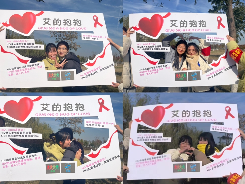 12月1日,校自律委员会同学们在毓秀楼旁开展“艾”的抱抱活动。活动现场,由志愿者扮演成艾滋病患者在路边“求抱抱”,同学们纷纷上去拥抱、合影,活动吸引更多同学自觉参与到了禁毒防艾宣传活动中来,用自己的亲身行动减少了大众对艾滋病的误区,对艾滋病患者的歧视,同学们踊跃参与,严寒凉风不减热情。小学教育系本科班汪娟同学表示:“这次的活动让我认识到毒品与艾滋病之间的关联及危害,也了解更多的禁毒防艾知识和法律法规,今后我要树立正确的人生观、价值观和世界观,从自身做起,远离毒品,健康生活。