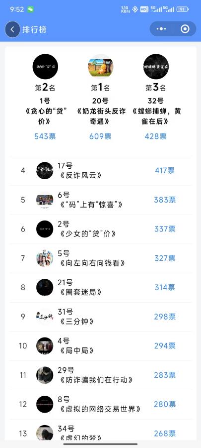 大赛采用网络大众投票与线下评委打分相结合的方式进行。网络投票环节吸引了广大师生和家长的关注与参与,36份参赛作品累计收获高达8368票,浏览量突破36820人次,在全体师生中掀起来一股反诈防骗宣传热潮。线下评审组由学校相关部门负责人、辅导员代表和学生代表共9人组成,从内容主题、制作技术、表演效果和社会价值等四个方面,全面考量作品的反诈宣传效果、创意构思、制作质量以及社会影响力等综合表现,对所有作品进行评分。经过激烈角逐,大赛最终评选出了一等奖4名 、二等奖7名、三等奖11名和优秀奖若干,并根据网络投票数评出“网络最佳人气奖”10名。