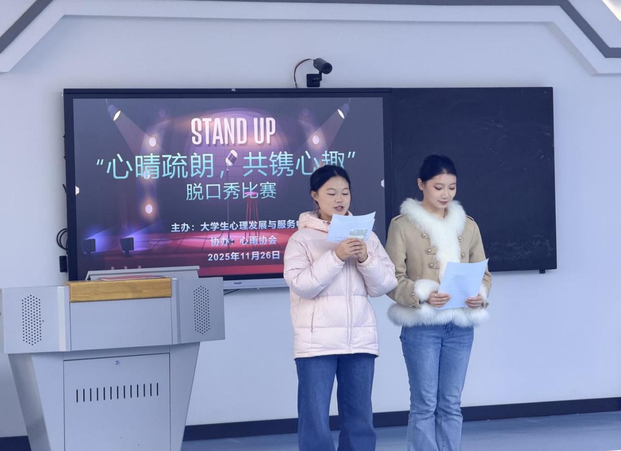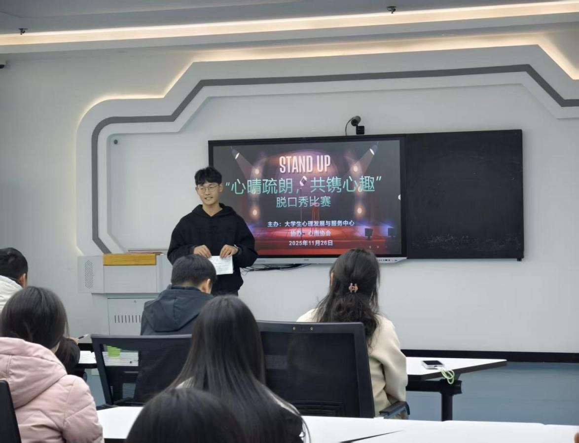 11月26日下午,由大学生心理发展与服务中心主办,心雨协会承办的“心晴疏朗,共镌心趣”脱口秀比赛在毓秀楼智慧教室举行。自活动通知发布后,同学们积极报名,踊跃参与,15个作品经过初步筛选进入现场展演环节,为我们带来一阵欢声笑语。