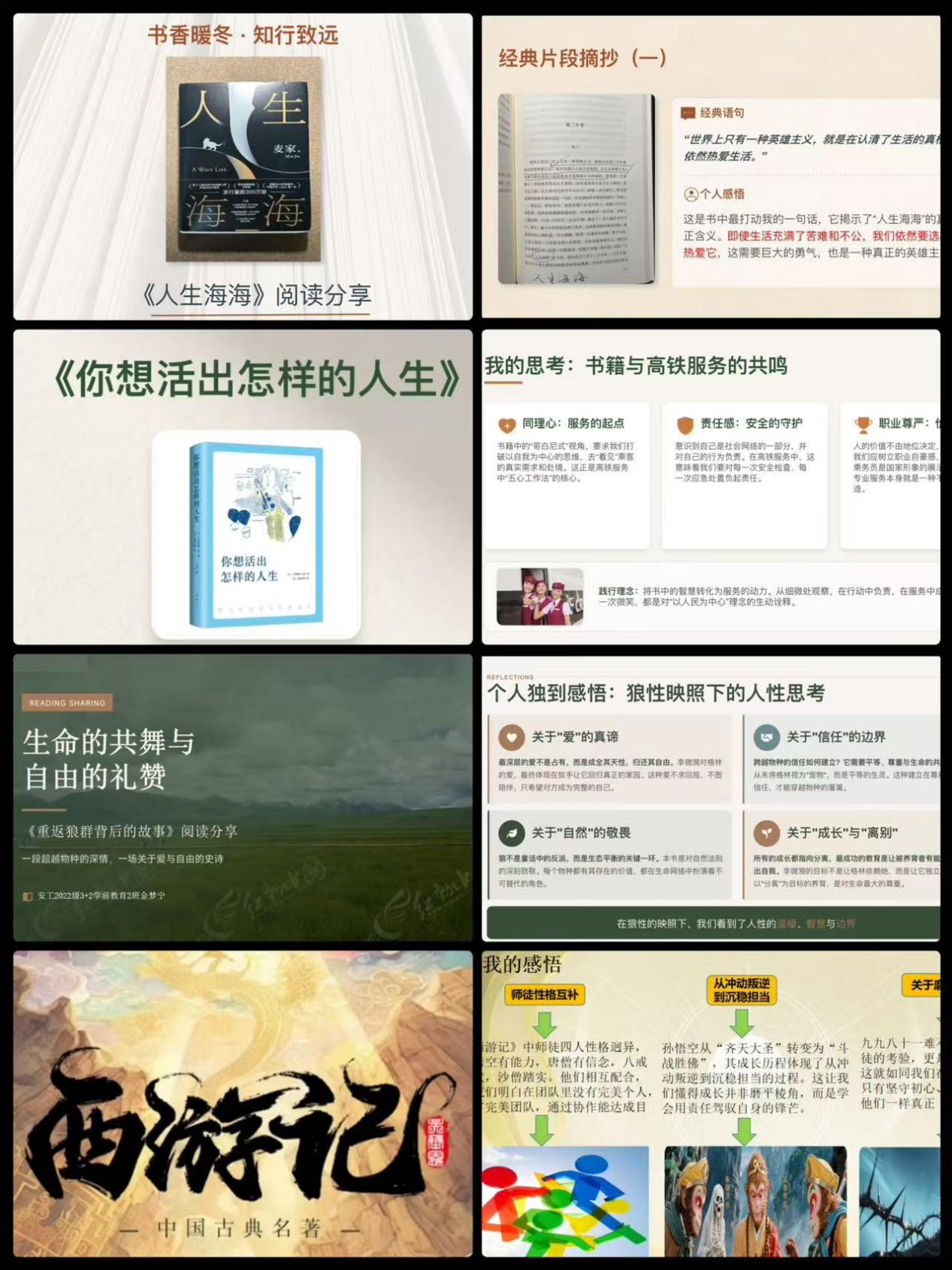 最是书香能致远,腹有诗书气自华。“书香暖冬・知行致远”寒假阅读共享活动吸引同学们与经典为伴、与书香同行。假期里同学们放下浮躁、静心品读,广泛涉猎经典文学、成长励志、人文社科等各类书籍,在《人生海海》中体悟生活的英雄主义,在《我与地坛》里感受生命的坚韧与力量,在《你想活出怎样的人生》中思考价值与方向,在《重返狼群背后的故事》中看见爱、自由与生命的敬畏……