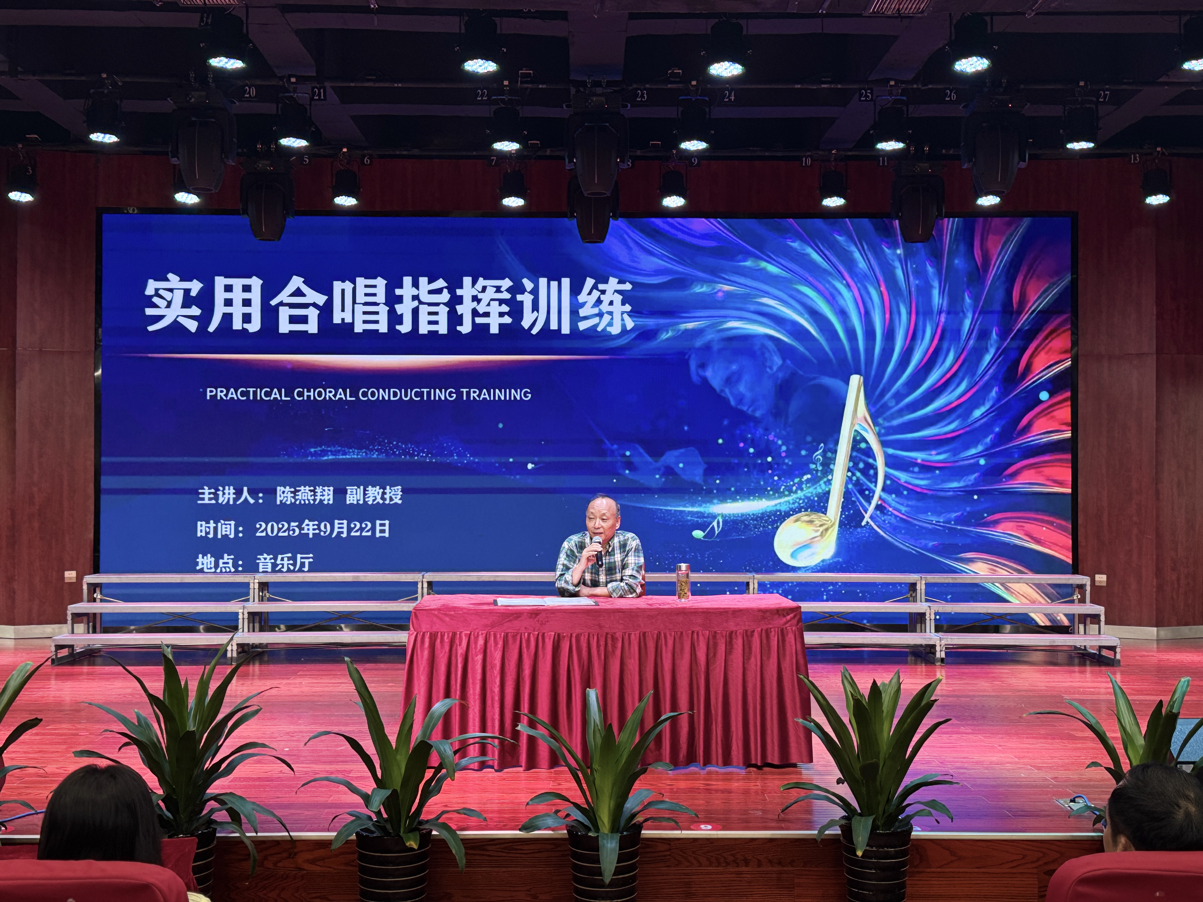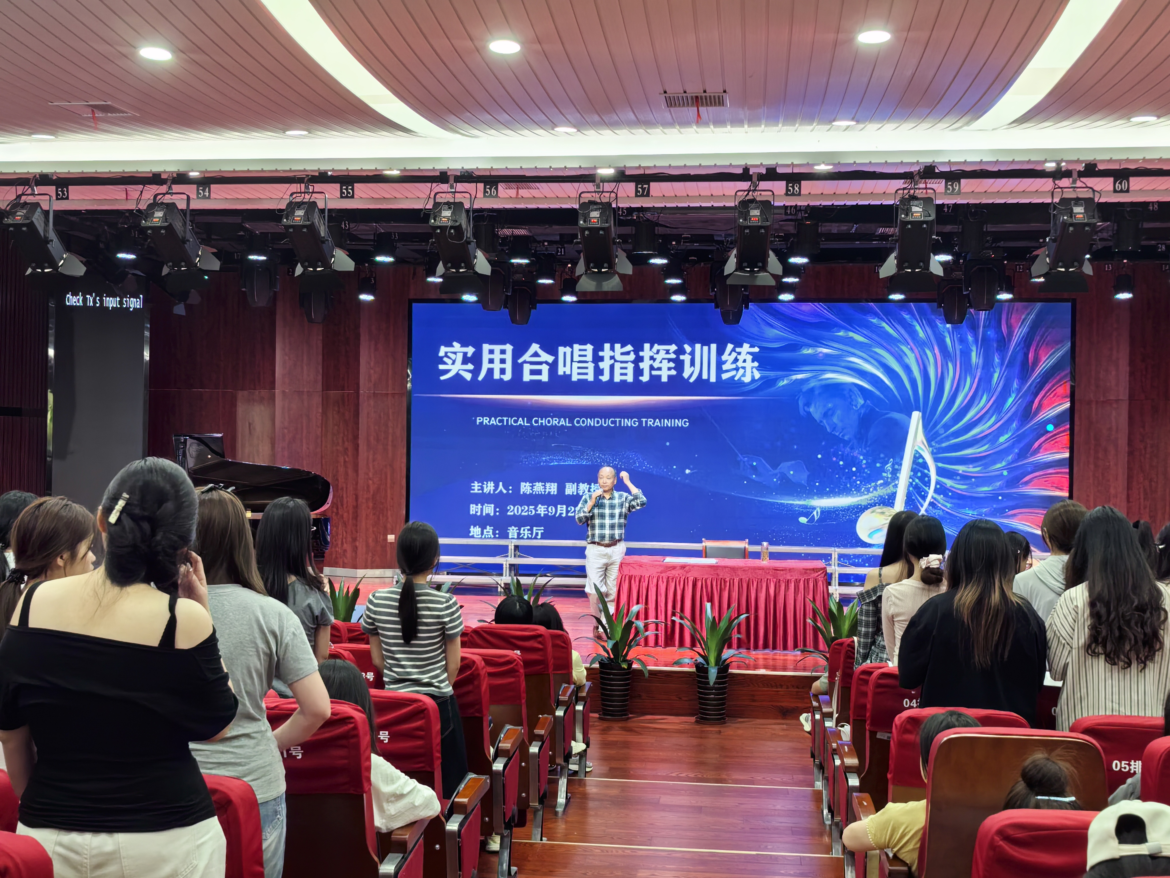 为提升我系师生的合唱与指挥专业技能,夯实合唱艺术实践基础,艺术与设计系于9月22日下午在校音乐厅成功举办“实用合唱与指挥训练”讲座。本次讲座特邀安庆师范大学陈燕翔副教授担任主讲,系领导、专业教师、音乐专业学生以及校老年大学合唱班学员共200多人参与。