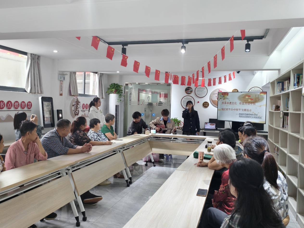 金秋送爽,丹桂飘香,在中秋佳节即将到来之际,为传承非遗文化、弘扬传统节日精神,9月30日上午,桐城师范高等专科学校艺术与设计系联合西苑社区,在西苑社区红色港湾开展“月满中秋·非遗之音传情”非遗进社区活动。桐城师专2023年度校级人文社科青年项目“非遗传统与现代高校‘双向奔赴’——桐城歌在桐城师专的传承、发展实践”(项目编号:TCSZ2023SKqn01)负责人周今老师、艺术与设计系学生党支部书记程周鹏老师、系团总支书记胡文君老师,与系部团员青年、入党积极分子及青年志愿者共同参与,与西苑社区居民齐聚一堂,在文化交融中共度温馨时光。