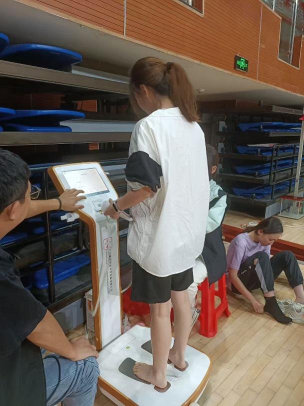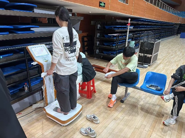 测试当天,各项工作有条不紊推进。工作人员严格依照《国民体质测定标准》,对学生展开多维度检测:身体形态维度包含身高、体重、体脂率等指标;生理机能维度聚焦肺活量、血压等项目;身体素质维度则涵盖握力、坐位体前屈、立定跳远,以及分性别进行的仰卧起坐(女)与俯卧撑(男)测试,全面掌握学生体质状况。