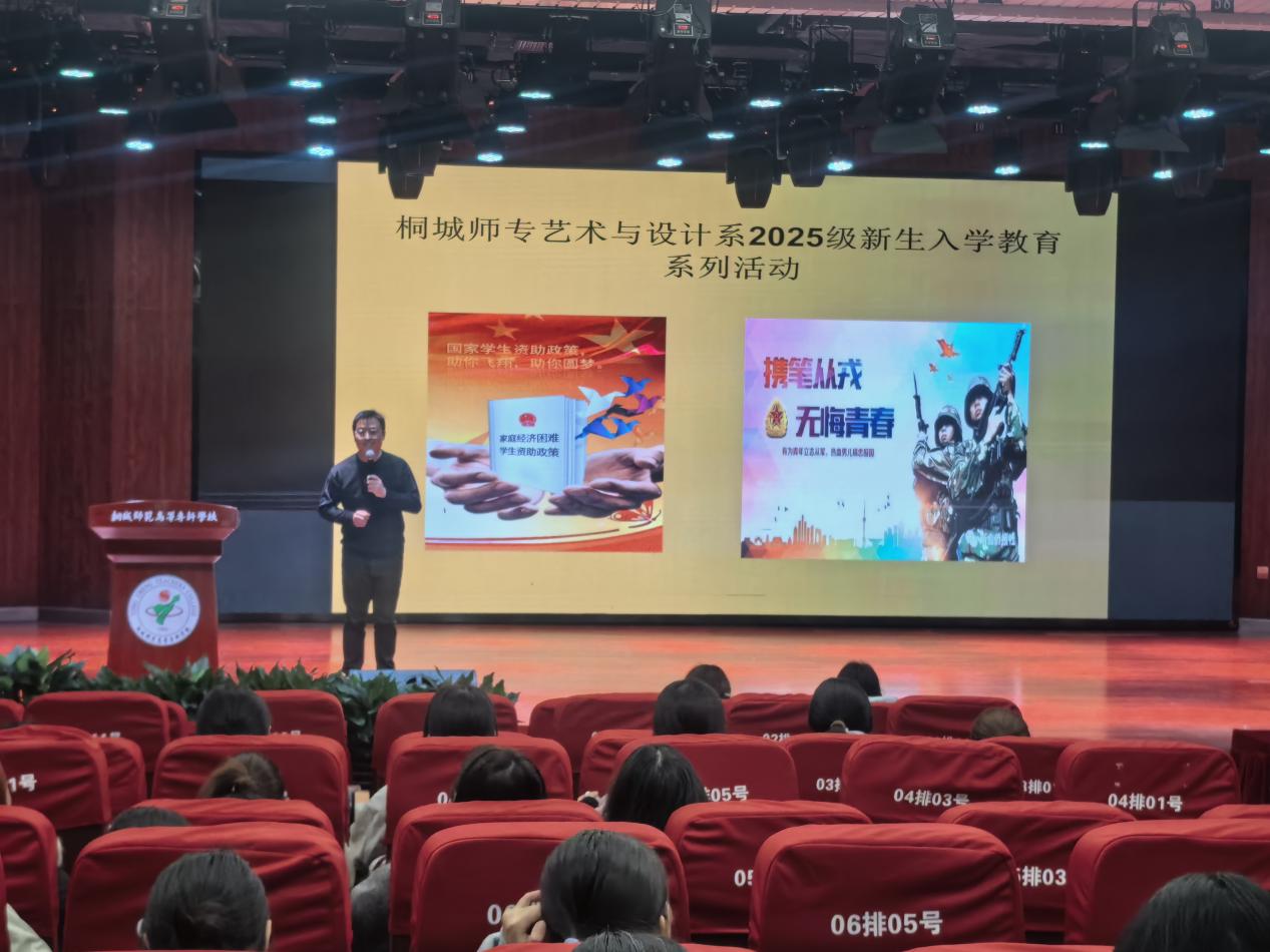 为深入贯彻落实国家资助政策,强化资助育人成效,进一步做好学生资助政策宣传工作,推进学生资助工作有序开展,让学生对资助政策“应知尽知”,增强广大青年学生的诚信意识和责任意识,加强资助育人工作力度,11月6日上午,艺术与设计系在音乐厅举办了2025级新生入学教育资助政策宣讲及应征入伍动员会,由系学管干事程周鹏主讲。两名25级辅导员及412名新生参加会议。