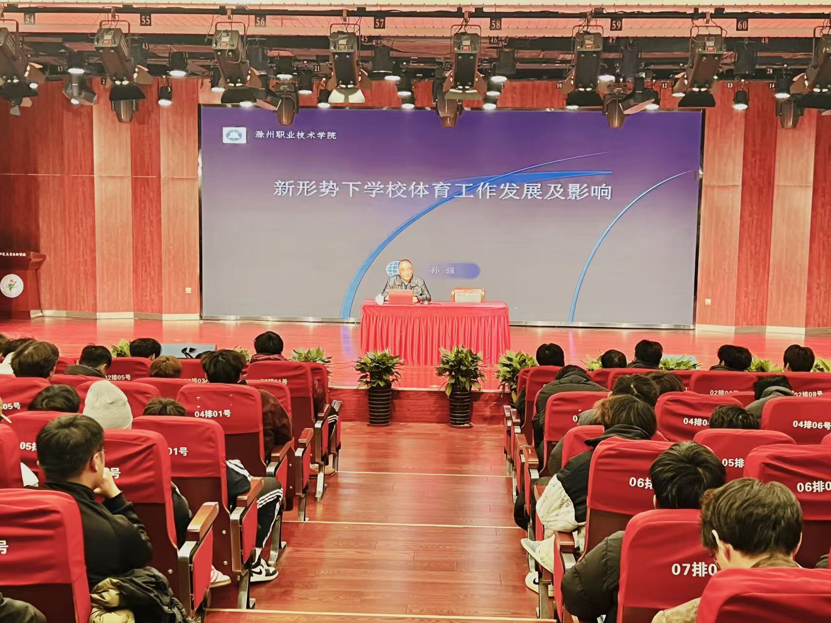 为深入贯彻落实党的二十大关于“加快建设教育强国、体育强国”的战略部署,积极响应《关于实施学生体质强健计划的意见》及《深化新时代中小学体育工作高质量发展的若干措施》等政策要求,我校特邀滁州职业学院体育部主任、安徽省学校体育协会专家孙强教授,于12月9日下午在校音乐厅举办《新形势下学校体育工作发展及影响》专题讲座。体育教育专业师生、系负责人200余人参会,现场座无虚席,交流氛围热烈。