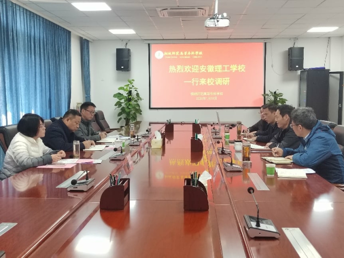 2026年1月15日上午,安徽理工学校党委书记朱灵群,党委副书记、校长李海军,党委委员、教务处主任阮媛一行莅临学校考察交流。校党委副书记、校长江贵生热情接待,党委委员、组织部长王斌,党委委员陈涛及教务处、小学教育系负责同志陪同座谈。双方就深化校际合作、共促区域职业教育高质量发展进行了深入的研讨。