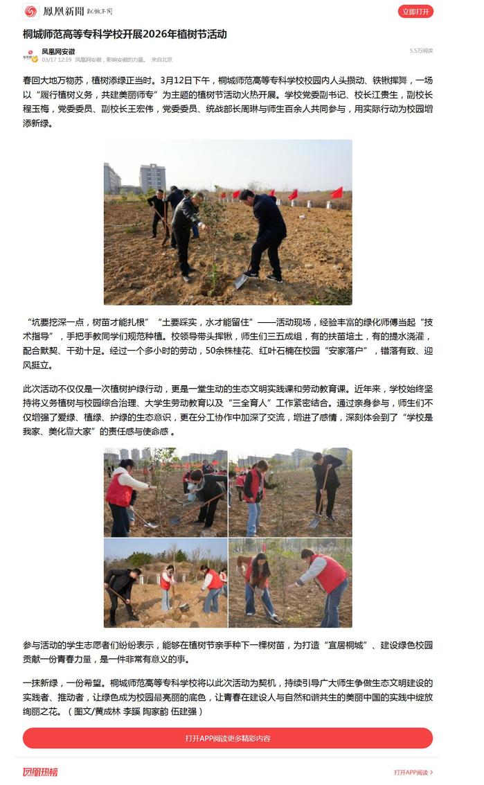 凤凰新闻:桐城师范高等专科学校开展2026年植树节活动