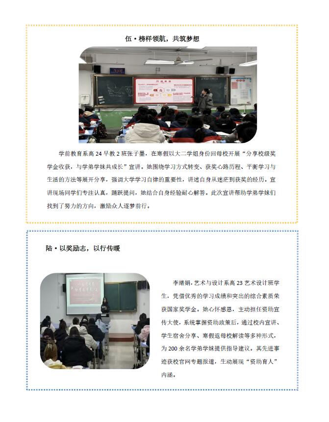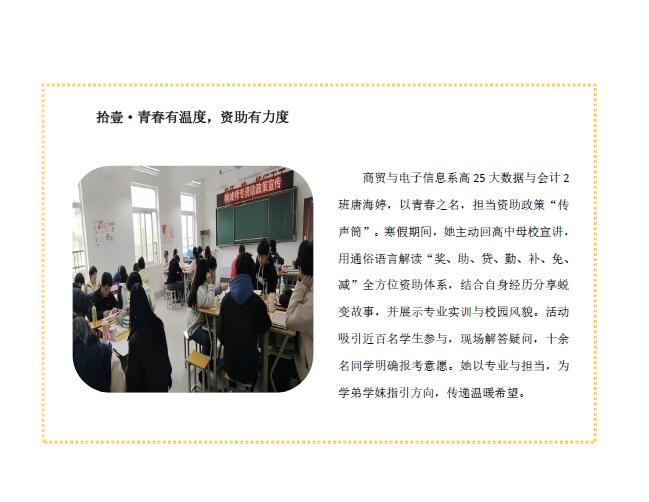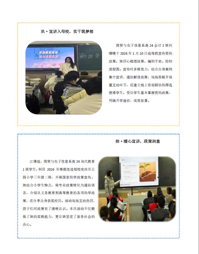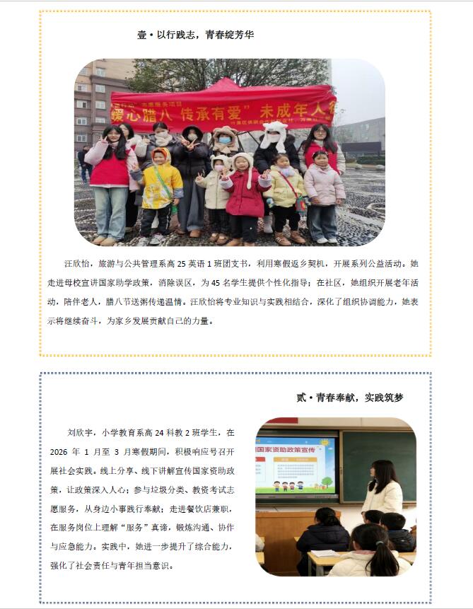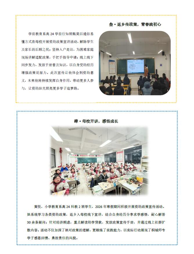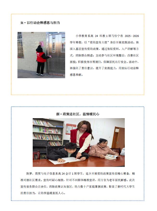 为强化资助育人实效,我校利用2026寒假积极组织和引导受助学生回家乡、返母校、落实宣传学生资助政策,增强社会责任感。活动开展前,安排专人组织开展相关资助政策培训,传授入户访谈、宣讲策划等技巧,确保政策宣传精准落地。他们有的走进社区开展资助宣讲,把政策与帮扶送到群众身边;有的回到母校分享经验,助力困难学子砥砺前行;还有的坚守基层参与志愿服务,用热忱服务居民、奉献社会,以青春力量践行责任与爱心。