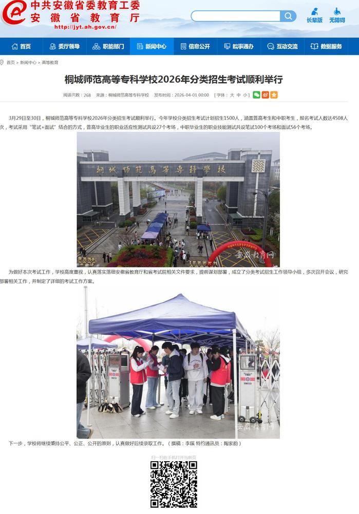 安徽教育网:桐城师范高等专科学校2026年分类招生考试顺利举行