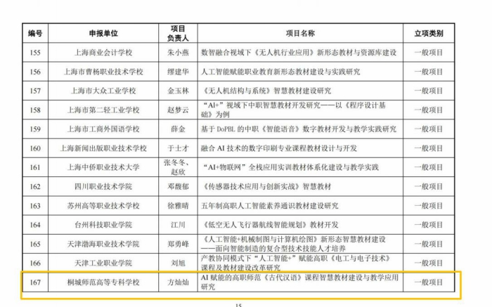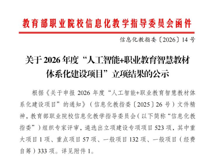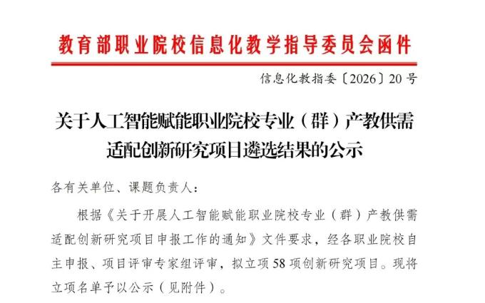 近日,教育部职业院校信息化教学指导委员会先后公布了“人工智能赋能职业院校专业(群)产教供需适配创新研究项目”与“人工智能+职业教育智慧教材体系化建设项目”的立项结果。桐城师专江贵生、方灿灿主持的课题双双获批立项。这是我校在教育部信息化教学改革领域高层级项目上的历史性突破,标志着学校在职业教育数字化转型、智慧教材建设及产教融合创新研究方面获得了国家层面的权威认可。