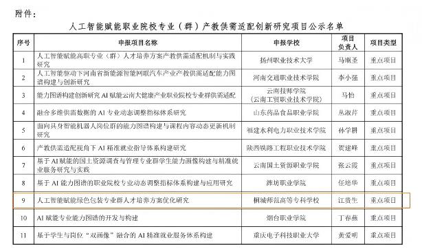 本次“人工智能赋能职业院校专业(群)产教供需适配创新研究项目”全国共立项58项,其中重点项目仅15项。江贵生主持的《人工智能赋能绿色包装专业群人才培养方案优化研究》成功获批重点项目,我校因此成为安徽省唯一获此重点项目立项的高职院校,实现了首次申报即成功获批的佳绩。